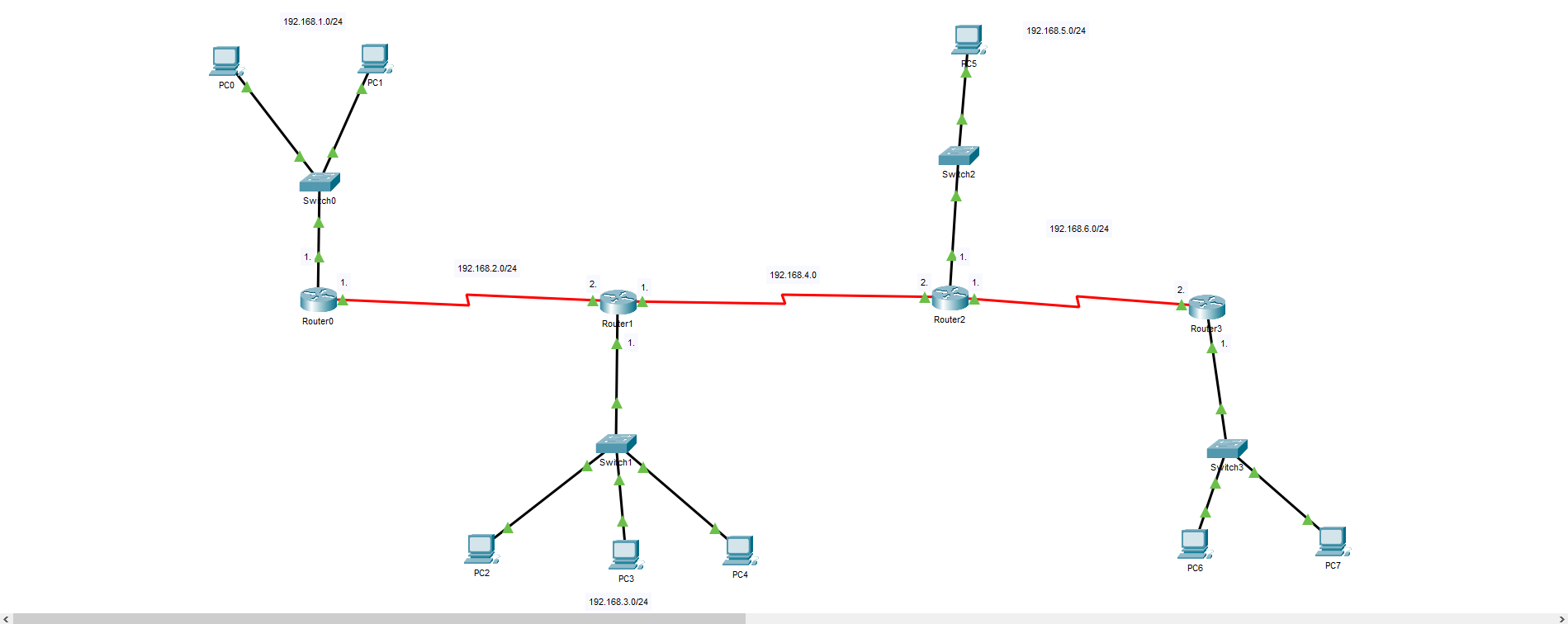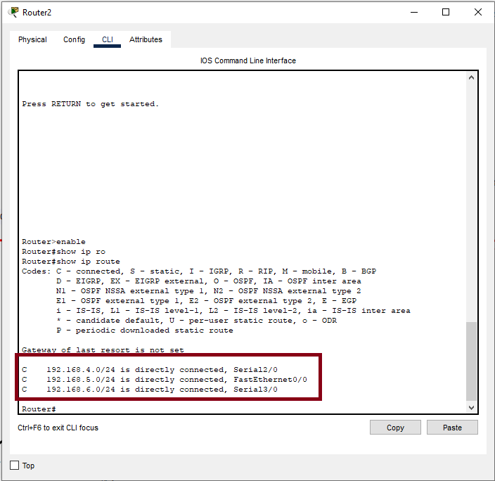 Nézzük az ábrát, ott nekünk a Router0 tud kommunikálni a 192.168.1.0-ás illetve 192.168.2.0-ás hálózattal, hisz azok interfészeit oda fele is konfiguráltuk ezért a routing tábla ismeri az oda vezető utat(de mondhatjuk konyhai nyelven úgy is, hogy a közvetlen mellette lévő hálózatokat eléri), viszont a többi hálózatot már nem éri el, hisz soha nem adtuk meg neki, az oda vezető elérési utat, ami esetleges csomag küldés esetén problémához vezet. Szintén, csak hogy még egy példát említsek, a Router2 eléri a 192.168.4.0, a 192.168.5.0-ás illetve a 192.168.6.0-ás hálózatot, hisz közvetlen mellette vannak, azaz konfiguráltuk a routerünket ahhoz a hálózathoz, így a routing tábla felismeri, az oda vezető utat(ábra). Ezt a problémát a Routolással tudjuk megoldani, azaz megadjuk a routernek az adott távoli hálózathoz vezető utat, vannak többféle routolási lehetőségek, mi most a statikus megoldást nézzük meg NEXT HOP segítségével.