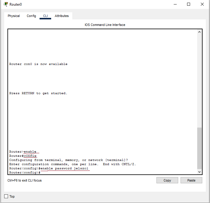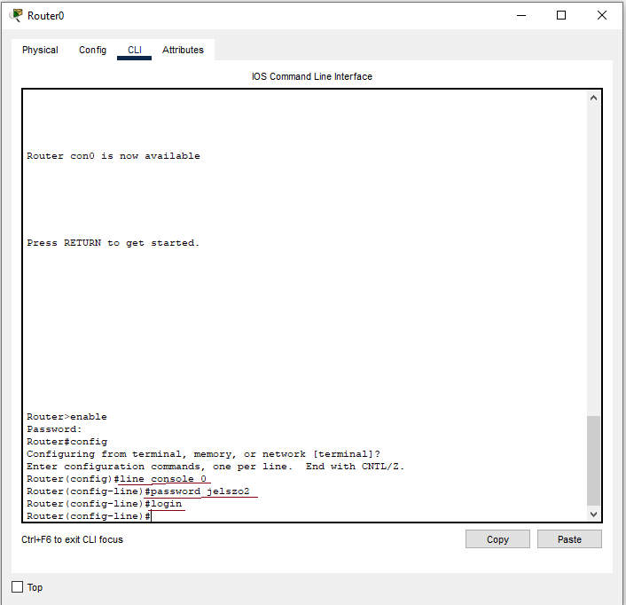 Konzol jelszó: enable -> config -> line console 0 -> ' password <jelszó> ' ez után enter, és végül egy ' login ' parancsot kell beírnunk a sikeres konzol jelszó állításához. Mind ezek után, ha megnyitjuk a konzolt(CLI), akkor ahhoz, hogy bele tudjunk kezdeni bármiféle konfigurációba, először be kell írnunk a megfelelő konzol jelszót.