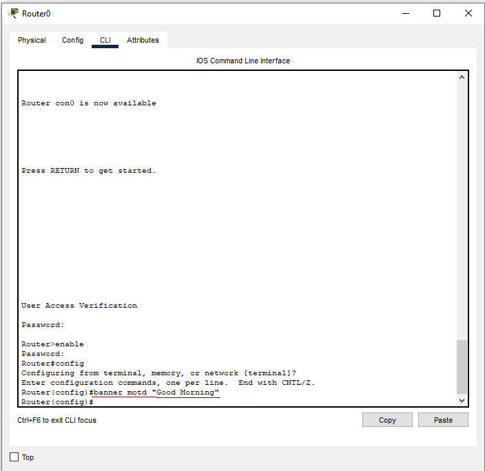 Banner állítás: enable -> config -> banner motd "szoveg". A szöveg beírása elméletileg bármilyen két karakter közé beírható( * *, ' ' ). Ezen parancs elvégeztével minden konzolba való belépés során, megjelenik majd a beírt szöveg.